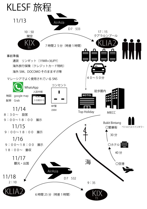 マ木曜日に日本からクアラルンプールに移動、金土日曜日は展示、月曜日に観光して深夜に帰国というスケジュールです。以前、メイカーフェア深圳でご一緒したことのあるI氏と昨年も一緒に参加したT君と一緒です。