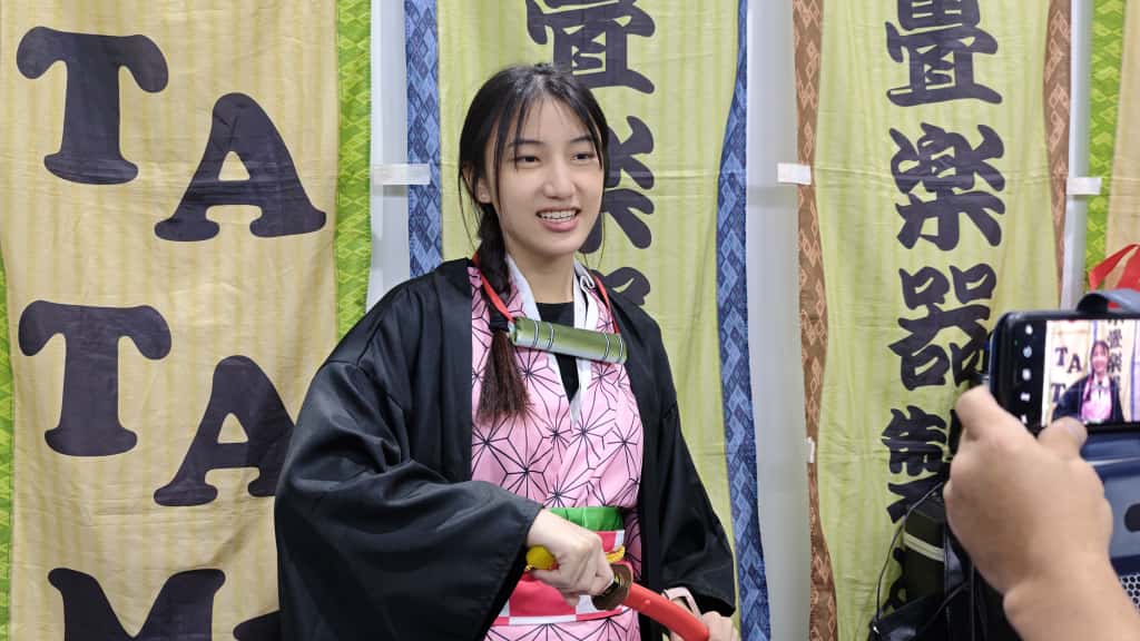 最初にKLESFに参加した年以来、私の発案で、着物の着付け体験というのをしています。今回は、ロボットのブースと畳バンドのブースの間に着物を10点ぐらいぶらさげて、自由に来てもらうようにしました。 |