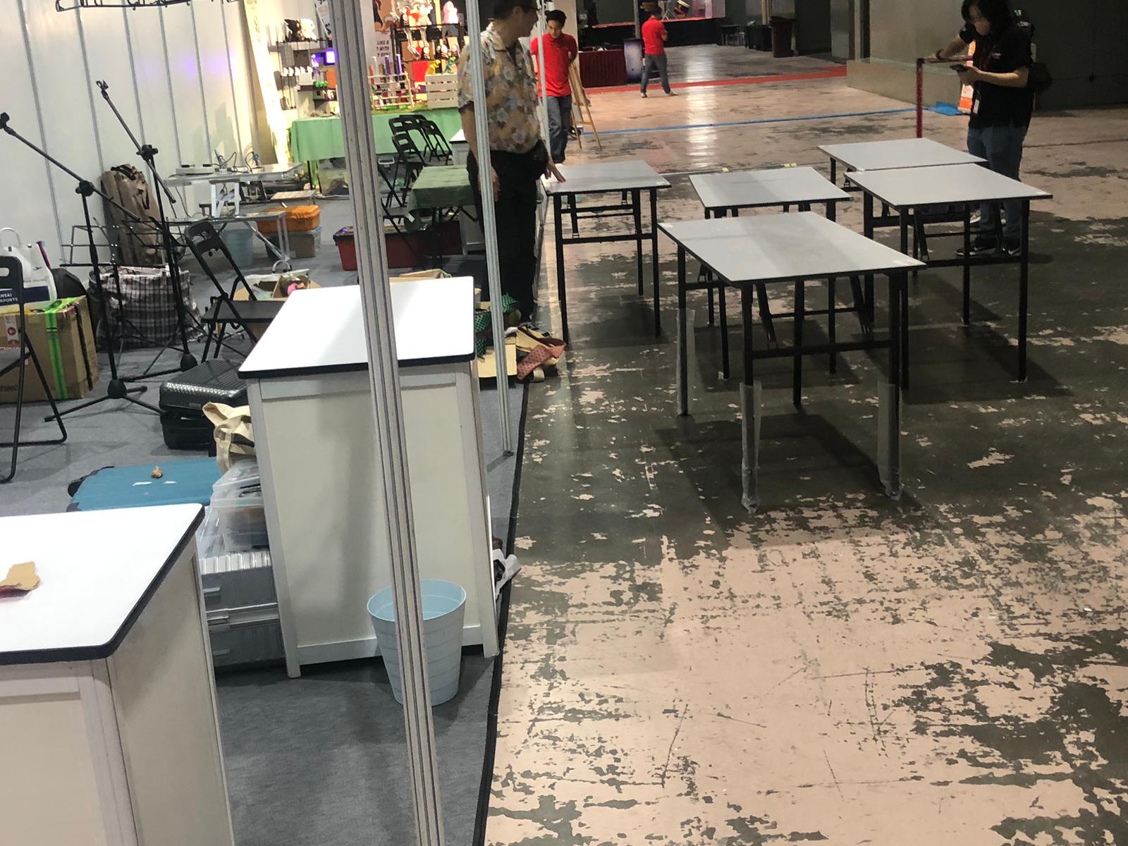 平日で来場者数が少な目です。本来9時にオープンですが、午前中にぼちぼちと、10時ぐらいまでブースの設置を行いました。ブースの区分けやテーブルの数も念を押して頼んでいたのですが、やっぱりテーブルのおらず、朝、ギリギリの時間に届きました。 |