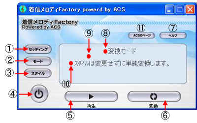 変換モードでは、MIDIファイルを読み込み、音楽スタイルやフォーマットの変換を行うことができます。たとえば、ビートルズのMIDIファイルをクラシック風に変換して演奏させたり、逆に、クラシックのMIDIファイルをロック風に変換して演奏させることができます。 また、MIDIファイルをNTTDoCoMoのMFiファイルに変換したり、vodafoneのSMAFファイルに変換したりすることが可能です。逆に、DOCOMOのMFiファイルやvodafoneのSMAFファイルをMIDIファイルに変換することもできます。 |