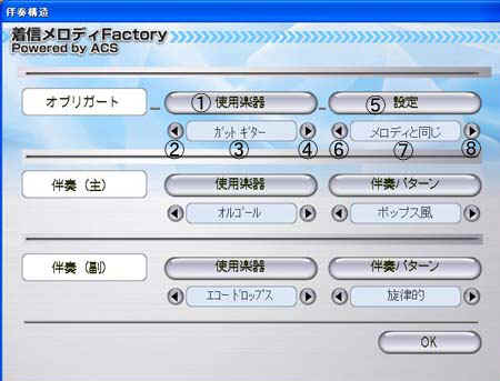 グループでは、オブリガート(サブ・メロディ)での「使用楽器」、演奏に使用する「音域」をそれぞれ設定できます。