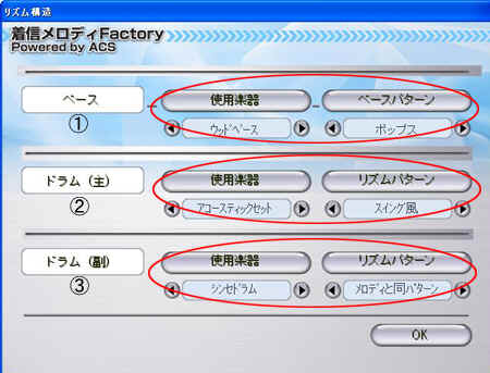 』の「使用楽器」、「リズムパターン」を設定するためのダイアログボックスです。
