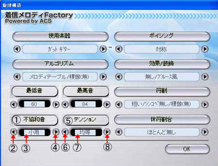 グループでは、選択した音楽スタイルの「不協和音」、「テンション」を設定できます。