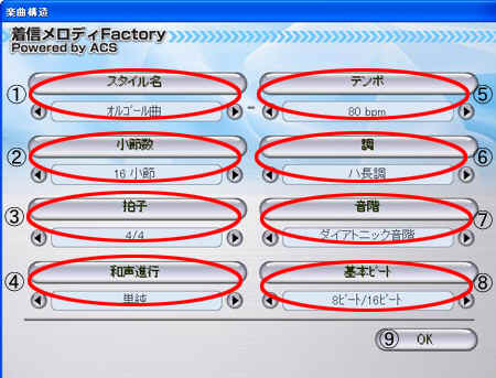 ボタンでは、音楽スタイルのコード進行を指定します。